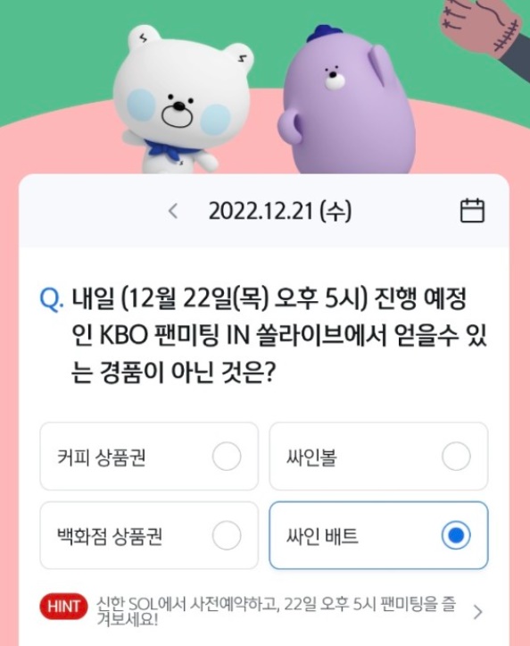 Q. 내일 (12월 22일(목) 오후 5시) 진행 예정인 KBO 팬미팅 IN 쏠라이브에서 얻을 수 있는 경품이 아닌 것은?