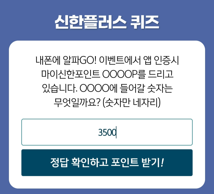 Q. 내폰에 알파GO 이벤트에서 앱 인증시 마이신한포인트 OOOOP를 드리고 있습니다. OOOO에 들어갈 숫자는 무엇일까요?