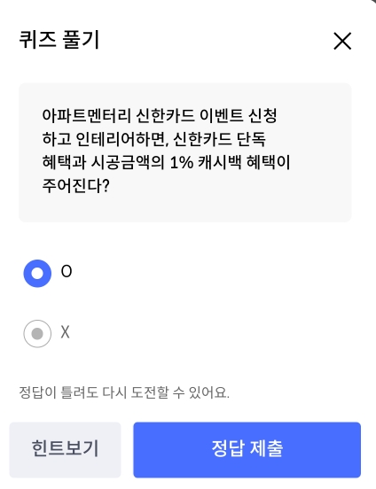 신한OX퀴즈. 아파트멘터리 신한카드 이벤트 신청하고 인테리어하면, 신한카드 단독 혜택과 시공금액의 1% 캐시백 혜택이 주어진다?